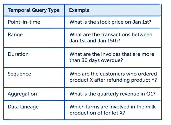 You can use temporal querying to deliver a variety of reports based on the goals of each team within the business. You can see some of examples of this in the table below: