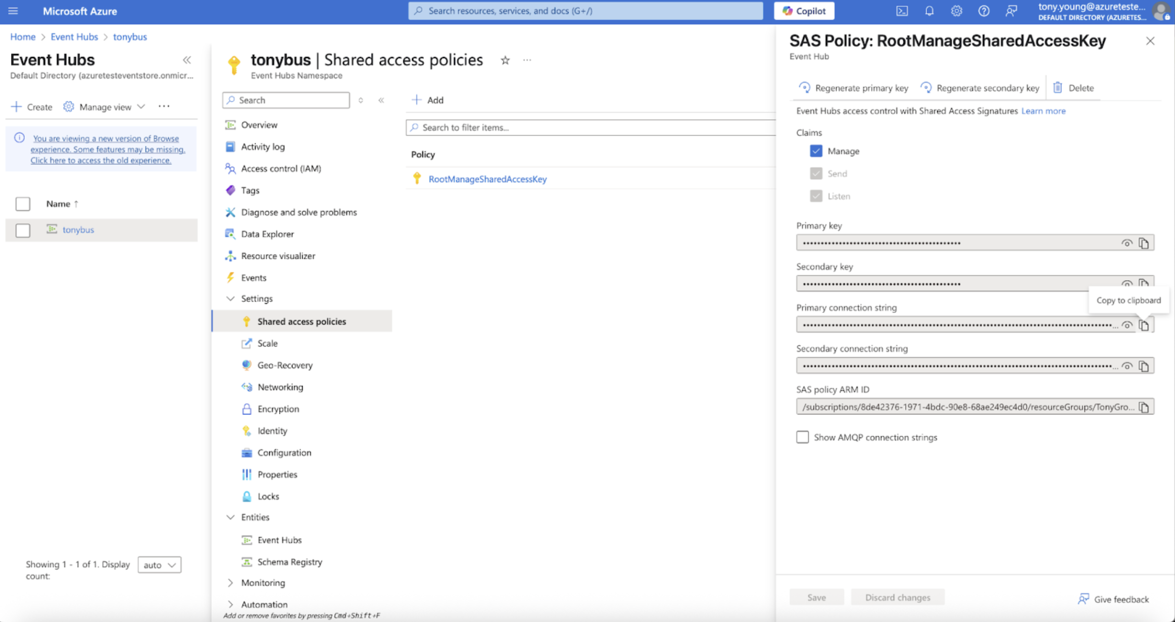 Choose your desired Access Policy and click its name in the list. Click the Copy to Clipboard button next to the Primary connection string field